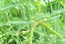 合萌,别名田皂角、水松柏、水槐子、水通草,中药名:梗通草。豆科一年生草本或亚灌木状植物,茎直立,叶对生,总状花序,腋生,花萼膜质,花冠淡黄色,子房扁平,线形。种子黑棕色,肾形,花果期7~10月。…全部>>