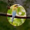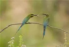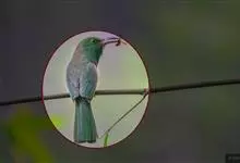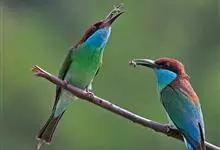 蓝喉蜂是蜂虎科蜂虎属鸟类。体长26-28厘米,嘴长而弯曲,有明显细长的中央尾羽。头部、颈部和背部为巧克力色,有黑色眼纹。喉部、腰部和尾羽为蓝色。腹部和两翼为绿色。幼鸟外观似成鸟,头部、颈部和背部为绿色,…全部>>