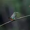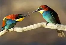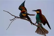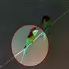 栗喉蜂虎是蜂虎科蜂虎属的鸟类。有热带鸟类羽毛艳丽的特征:喉部是栗红色的,黑色的过眼纹,翅膀和背部是绿色的,尾翼是蓝色的,飞行时翅膀下面的羽毛是橙黄色的,在阳光的照射下,它们全身闪烁着金属般的艳丽光泽,…全部>>