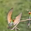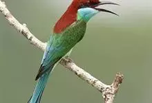绿喉蜂虎是佛法僧目、蜂虎科的小型鸟类,共有9个亚种。身长22-25厘米,翼展29-30厘米,体重15-20克。喉绿色,额部、头顶至上背为锈红色,其余上体均为亮绿色。中央尾羽延长且端段狭细,…全部>>