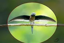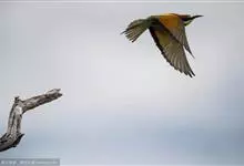 栗喉蜂虎是蜂虎科蜂虎属的鸟类。有热带鸟类羽毛艳丽的特征:喉部是栗红色的,黑色的过眼纹,翅膀和背部是绿色的,尾翼是蓝色的,飞行时翅膀下面的羽毛是橙黄色的,在阳光的照射下,它们全身闪烁着金属般的艳丽光泽,…全部>>