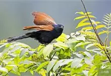 褐翅鸦鹃,是鹃形目鸦鹃科鸦鹃属的鸟类。褐翅鸦鹃的身体为黑色;头颈和胸带蓝紫色金属光泽并具黑亮的羽干纹,下胸至腹部泛金属绿光泽;两翼和肩部为棕栗色,外侧飞羽具暗色羽端,尾羽闪铜绿色光泽;虹膜赤红色,…全部>>