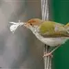 普通缝叶莺,是雀形目鹅科莺亚科缝叶莺属一种。体长10-14厘米,体重7-10克,雄鸟前额棕红,头顶至枕棕橄榄褐,上体橄榄绿染黄,飞羽及尾羽暗褐;繁殖期雄鸟的中央尾羽特形延长,下体淡皮黄白色。…全部>>