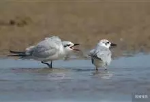 鸥嘴噪鸥,中型水禽,体长31~39厘米。夏羽额、头顶、枕和头的两侧从眼和耳羽以上黑色。背、肩、腰和翅上覆羽珠灰色。后颈、尾上覆羽和尾白色,中央一对尾羽珠灰色。尾呈深叉状。冬羽头白色,头顶和枕缀有灰色…全部>>