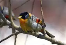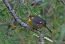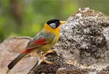 银耳相思鸟小型鸟类,体长14~18厘米。头顶黑色,耳羽银灰色,前额橙黄色;外侧飞羽橙黄色,基部朱红色,极为鲜艳、醒目。尾圆形,尾上、尾下覆羽朱红色,尾暗灰褐色,外侧尾羽橙黄色,其余上体橄榄绿或橄榄黄色。…全部>>
