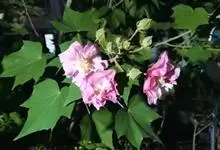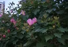 木芙蓉,锦葵科木槿属落叶灌木或小乔木。小枝上有细绒毛;叶片为卵状心形,托叶为披针形,常早落;花单生,花萼为钟形,花冠初为白色或淡红色,后逐渐变为深红色;果实为扁球形,有淡黄色的毛附着。花期8到10月。…全部>>