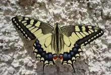 金凤蝶,是鳞翅目凤蝶科凤蝶属动物。金凤蝶为中型凤蝶,翅展70-84毫米,翅背面底色黑褐色,翅脉黑色,翅室具黄斑;前翅背面基部呈暗黄色,亚外缘为黑色,内具一列小黄斑;后翅背面亚外缘区具黑宽边,…全部>>