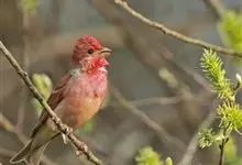 酒红朱雀小型鸟类,体长13~15厘米。雄鸟通体深红色,头部深朱红或棕红色,下背和腰玫瑰红色,眉纹粉红色而具丝绢光泽。两翅和尾黑褐或灰褐色、具暗红色狭缘,内侧两枚三级飞羽具淡粉红色先端。…全部>>
