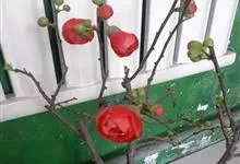 贴梗海棠Nakai)是蔷薇科、木瓜海棠属植物。落叶灌木,高达2米,枝条直立开展,有刺。叶片卵形至椭圆形,稀长椭圆形,长3-9厘米,宽1.5-5厘米。花先叶开放,3-5朵簇生于二年生老枝上。…全部>>