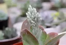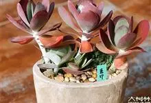 唐印为景天科伽蓝菜属的多年生肉质草本植物。植株中型,株高50厘米,宽20厘米,多分枝;叶片肉质,对生,卵形,全缘,先端钝圆,叶片淡绿色至灰绿色,表面被有厚厚的白粉,光照充足时,叶缘呈红色;圆锥花序,…全部>>