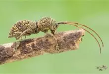 竹象鼻虫,Cyrtotrachelus longimanus,象甲科锥大象甲属的一种昆虫。分布于竹产区,是竹类的主要害虫。以幼虫蛀食竹笋,使笋枯死,还会蛀食1米多高的嫩竹,使其生长不良,节间缩短,…全部>>