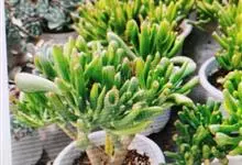 筒叶花月,是景天科青锁龙属的多年生草本植物。植株多分株,灌木状,茎较粗壮,圆柱形,表皮灰褐色;叶片肉质,互生,呈圆筒状,簇生于茎或分枝顶端,叶端呈斜截形,截面为椭圆形;花呈星状,淡白色;花期秋季。…全部>>