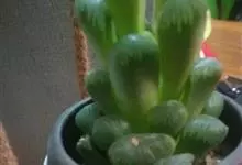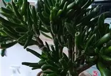 筒叶花月,是景天科青锁龙属的多年生草本植物。植株多分株,灌木状,茎较粗壮,圆柱形,表皮灰褐色;叶片肉质,互生,呈圆筒状,簇生于茎或分枝顶端,叶端呈斜截形,截面为椭圆形;花呈星状,淡白色;花期秋季。…全部>>