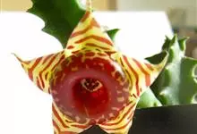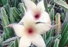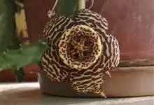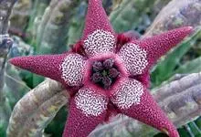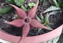 巨花犀角又称大豹皮花,是夹竹桃科犀角属的一种植物。茎粗,花大,边缘生长细毛。植株柱形多分枝呈丛生,柱形具4棱,棱缘具细小疣突。花大,五角星形黄色,并有横向棕褐色斑纹,似豹皮而得名。花期夏秋两季。…全部>>