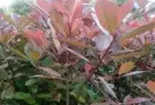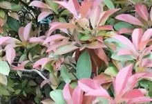 红叶石楠 是蔷薇科,石楠属杂交种,为常绿小乔木或灌木,乔木高可达5米、灌木高可达2米。叶片革质,长圆形至倒卵状、披针形,叶端渐尖,叶基楔形,叶缘有带腺的锯齿,花多而密,复伞房花序,花白色,梨果黄红色,…全部>>