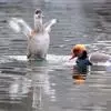 赤嘴潜鸭俗称大红头,是大型鸭类,个体比绿头鸭小,体长45-55厘米,体重1千克左右。雄鸟头浓栗色,具淡棕黄色羽冠。上体暗褐色,翼镜白色,嘴赤红色。下体黑色,两胁白色,特征极明显,野外容易辨别。…全部>>