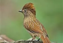 条纹噪鹛是画眉科、噪鹛属中型鸟类,体长28-32厘米。头具短的羽冠,上体栗褐色,飞羽外翻蓝灰色。下体棕栗色,腹以后转为褐白色。除飞羽和尾羽外,所有上、下体羽均具白色羽干纹。极为醒目。野外特征明显,…全部>>