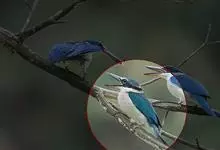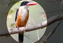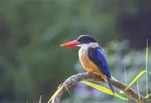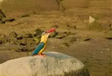鹳嘴翡翠:体长33-37厘米。体重140-200克。共有13个亚种,体型大,嘴形巨大、侧扁,似鹳嘴,红色,嘴峰两侧有鼻沟。头灰褐色,上体蓝色,下体和宽阔的领环赭土色,脚红色。飞翔时翅上无斑。全部>>