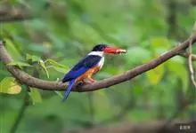 白领翡翠:有50个亚种。体长18厘米,体重35-40克。是一种蓝白色翡翠鸟。头顶、两翼、背及尾呈亮丽蓝绿色;过眼纹黑色;眼先黑色,眼眉白色或浅黄色,嘴上部具白点。以白色的颈环及下体为识别特征。…全部>>