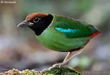 绿胸八色鸫:是雀形目八色鸫科的鸟类,共有12个亚种。体长为16-18厘米,体重65-69克。体型圆胖,尾短,腿长。头黑,上体绿色,两翼深色而具白色斑纹,头顶至后枕深褐,胸及腹部苹果绿,臀亮红。…全部>>