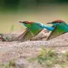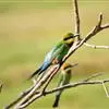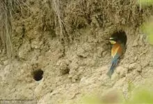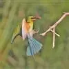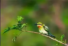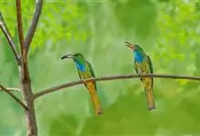 栗喉蜂虎是蜂虎科蜂虎属的鸟类。有热带鸟类羽毛艳丽的特征:喉部是栗红色的,黑色的过眼纹,翅膀和背部是绿色的,尾翼是蓝色的,飞行时翅膀下面的羽毛是橙黄色的,在阳光的照射下,它们全身闪烁着金属般的艳丽光泽,…全部>>