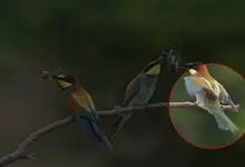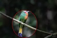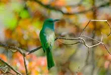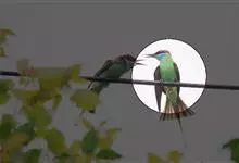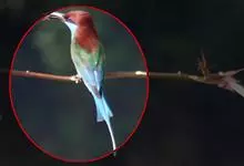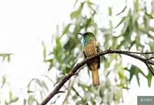 蓝喉蜂是蜂虎科蜂虎属鸟类。体长26-28厘米,嘴长而弯曲,有明显细长的中央尾羽。头部、颈部和背部为巧克力色,有黑色眼纹。喉部、腰部和尾羽为蓝色。腹部和两翼为绿色。幼鸟外观似成鸟,头部、颈部和背部为绿色,…全部>>