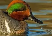 绿翅鸭是小型鸭类,体长37厘米,体重约0.5千克。嘴脚均为黑色。雄鸟头至颈部深栗色,头顶两侧从眼开始有一条宽阔的绿色带斑一直延伸至颈侧,尾下覆羽黑色,两侧各有一黄色三角形斑,在水中游泳时,极为醒目。…全部>>
