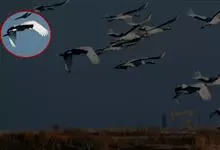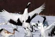 丹顶鹤:是鹤科、鹤属的一种大型涉禽,体长120-160厘米。颈、脚较长,通体大多白色,头顶鲜红色,喉和颈黑色,耳至头枕白色,脚黑色,站立时颈、尾部飞羽和脚黑色,头顶红色,…全部>>