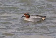 绿翅鸭是小型鸭类,体长37厘米,体重约0.5千克。嘴脚均为黑色。雄鸟头至颈部深栗色,头顶两侧从眼开始有一条宽阔的绿色带斑一直延伸至颈侧,尾下覆羽黑色,两侧各有一黄色三角形斑,在水中游泳时,极为醒目。…全部>>