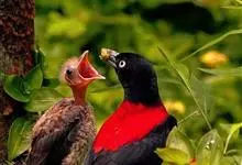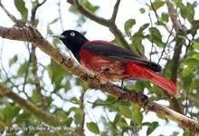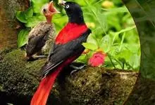 朱鹂:中等鸟类,体长23-28厘米。雄鸟绛紫红色,头、上胸及翼黑色。雌鸟上背及背部深灰色,尾覆羽及尾绛紫红色,腹部及下胸白而密布黑色纵纹。与鹊色鹂幼鸟的区别在上背灰色较深,下体白色较少且纵纹较粗。…全部>>