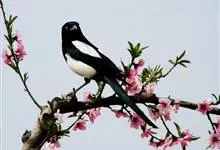 喜鹊:是鸦科、鹊属的一种鸟类。共有11个亚种。体长40-50厘米,雌雄羽色相似,头、颈、背至尾均为黑色,并自前往后分别呈现紫色、绿蓝色、绿色等光泽,双翅黑色而在翼肩有一大形白斑,尾远较翅长,呈楔形,…全部>>