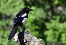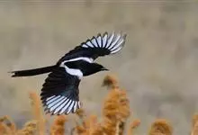 喜鹊:是鸦科、鹊属的一种鸟类。共有11个亚种。体长40-50厘米,雌雄羽色相似,头、颈、背至尾均为黑色,并自前往后分别呈现紫色、绿蓝色、绿色等光泽,双翅黑色而在翼肩有一大形白斑,尾远较翅长,呈楔形,…全部>>