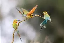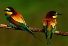栗喉蜂虎是蜂虎科蜂虎属的鸟类。有热带鸟类羽毛艳丽的特征:喉部是栗红色的,黑色的过眼纹,翅膀和背部是绿色的,尾翼是蓝色的,飞行时翅膀下面的羽毛是橙黄色的,在阳光的照射下,它们全身闪烁着金属般的艳丽光泽,…全部>>