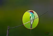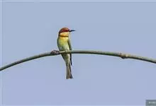 栗喉蜂虎是蜂虎科蜂虎属的鸟类。有热带鸟类羽毛艳丽的特征:喉部是栗红色的,黑色的过眼纹,翅膀和背部是绿色的,尾翼是蓝色的,飞行时翅膀下面的羽毛是橙黄色的,在阳光的照射下,它们全身闪烁着金属般的艳丽光泽,…全部>>