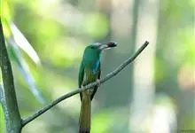蓝须夜蜂虎是佛法僧目、蜂虎科的鸟类,体长约30厘米,是绿色林栖型蜂虎,蓝色的胸羽蓬松,嘴厚重而下弯。成鸟顶冠淡蓝,腹部棕黄带绿色纵纹。尾羽腹面黄褐。亚成鸟全身绿色。喉、胸部中央的羽甚长和亮色;该物种…全部>>