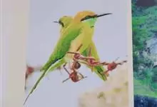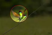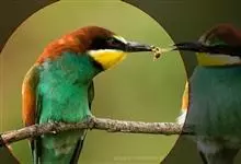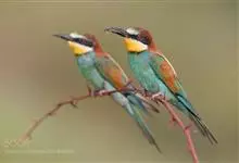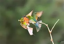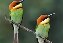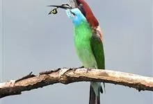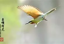 栗喉蜂虎是蜂虎科蜂虎属的鸟类。有热带鸟类羽毛艳丽的特征:喉部是栗红色的,黑色的过眼纹,翅膀和背部是绿色的,尾翼是蓝色的,飞行时翅膀下面的羽毛是橙黄色的,在阳光的照射下,它们全身闪烁着金属般的艳丽光泽,…全部>>