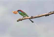 蓝喉蜂是蜂虎科蜂虎属鸟类。体长26-28厘米,嘴长而弯曲,有明显细长的中央尾羽。头部、颈部和背部为巧克力色,有黑色眼纹。喉部、腰部和尾羽为蓝色。腹部和两翼为绿色。幼鸟外观似成鸟,头部、颈部和背部为绿色,…全部>>
