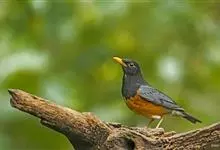 赤胸鸫是鸫科、鸫属中型鸟类,体长22-24厘米。整个头、颈和喉暗橄榄褐色或灰褐色,上体橄榄褐色。胸和两胁橙红色,腹以下白色。下嘴黄色,脚橙黄色具黄色眼圈。虹膜褐色,上嘴褐色,下嘴黄色,脚黄色。…全部>>