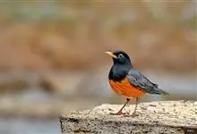 黑胸鸫属中型鸟类,体长20-30厘米。雄鸟整个头、颈、胸黑色,其余上体暗灰色,下体橙棕色,极为醒目。嘴、脚蜡黄色。雌鸟上体橄榄褐色,颏、喉白色,上胸橄榄褐色具黑色斑点,其余与雄鸟相似。…全部>>