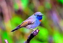 棕胸蓝姬鹟:属小型鸣禽,体长10-13厘米,体重6-10克,是一种体型很小的灰蓝及棕色鹟,雌雄羽色不同,雄鸟羽色艳丽,雌鸟羽色暗淡。雄鸟上体深蓝色,胸橙黄色,下腹灰白色。亚成鸟具褐色斑驳。…全部>>