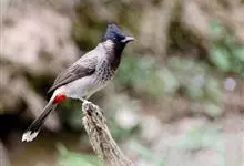 黑喉红臀鹎是雀形目鹎科鹎属鸟类,别称有黑头公、红臀鹎。头顶黑色具光泽;后颈、肩和背暗褐具灰色狭缘;腰羽几纯暗褐,尾上覆羽近白色,羽端浅灰褐色;尾羽褐黑,中央尾羽具狭窄的白色端斑,…全部>>