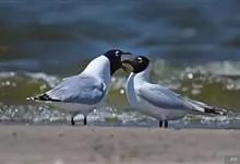 鸥嘴噪鸥,中型水禽,体长31~39厘米。夏羽额、头顶、枕和头的两侧从眼和耳羽以上黑色。背、肩、腰和翅上覆羽珠灰色。后颈、尾上覆羽和尾白色,中央一对尾羽珠灰色。尾呈深叉状。冬羽头白色,头顶和枕缀有灰色…全部>>