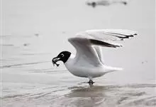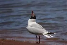 黑嘴鸥 中型水鸟,体长31~39厘米。嘴黑色,脚红色。夏羽头黑色,眼上和眼 下具白色星月形斑,在黑色的头上极为醒目。颈、腰、尾上覆羽、尾和下体白色。初级飞羽末端具黑色斑点。翼下仅部分初级飞羽黑色,与…全部>>