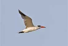 红嘴巨鸥,大型水鸟,体长47~55厘米。夏羽前额、头顶、枕和冠羽黑色。后颈、尾上覆羽和尾白色,尾呈叉状。背、肩和翅上覆羽银灰色。眼先和眼及耳羽以下头侧白色;颏、喉和整个下体也为白色。冬羽和夏羽大致相似,…全部>>
