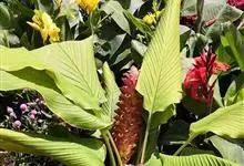 郁金是姜科、姜黄属植物。植株高约1米;根茎肉质,椭圆形或长椭圆形,内部黄色,芳香;根端紡锤状。叶基生,叶片长圆形,长30-60厘米,宽10-20厘米。花葶单独由根茎抽出,与叶同时发出或先叶而出,…全部>>
