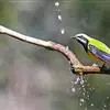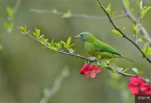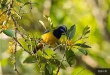 橙腹叶鹎体形大小和金额叶鹎相似,体长16~20厘米。额至后颈黄绿色,其余上体绿色,小覆羽亮钴蓝色,形成明显的肩斑。颏、喉、上胸黑色具钴蓝色髭纹,其余下体橙色。飞羽和尾羽雄鸟黑色、雌鸟绿色。…全部>>