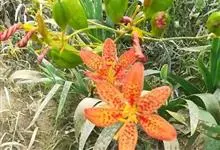 射干 Redouté)是鸢尾科射干属多年生草本植物。根状茎为不规则的块状,斜黄色或黄褐色;花橙红色,散生紫褐色的斑点;花药呈条形;子房下位,倒卵形;蒴果倒卵形或长椭圆形;种子圆球形,黑紫色,有光泽。…全部>>