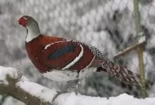 白颈长尾雉:大型鸡类,体长81厘米,体型大小和雉鸡相似。雄鸟头灰褐色,颈白色,脸鲜红色,其上后缘有一显著白纹,上背、胸和两翅栗色,上背和翅上均具1条宽阔的白色带,极为醒目;下背和腰黑色而具白斑;腹白…全部>>