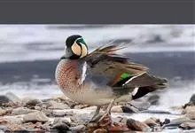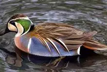 绿翅鸭是小型鸭类,体长37厘米,体重约0.5千克。嘴脚均为黑色。雄鸟头至颈部深栗色,头顶两侧从眼开始有一条宽阔的绿色带斑一直延伸至颈侧,尾下覆羽黑色,两侧各有一黄色三角形斑,在水中游泳时,极为醒目。…全部>>