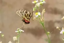 曙凤蝶是凤蝶科、曙凤蝶属蝴蝶。体背黑色,头、颈、胸侧及腹侧具红色鳞毛。雌、雄异型。雄蝶翅黑绒色,后翅的臀缘褶很大,反卷且具灰白色体毛的性标。雌蝶前翅大部及后翅色淡,…全部>>